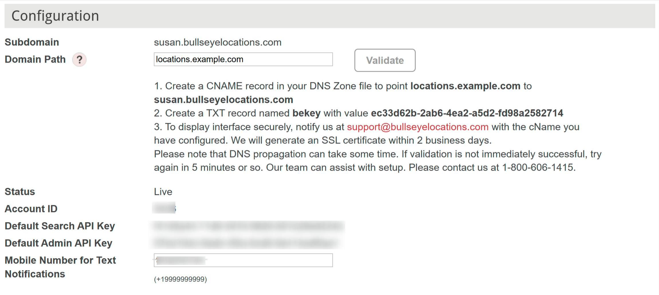 Please note that DNS propagation can take some time. If validation is not immediately successful, try again in 5 minutes or so. Our team can assist with setup. Please contact us at 1-800-606-1415